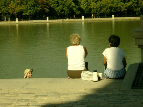 Es ist so heiß, dass die Hitze selbst im sonnengewohnten Spanien die erste Meldung der Hauptnachrichten ist. Um die größte Hitze zu umgehen, müsste man eigentlich von 10 Uhr morgens bis 10 Uhr abends im klimatisierten Hotelzimmer bleiben. Das macht für eine touristische Familie allerdings wenig Sinn. Wir gehen in den Retiro-Park, wo ich mit einer Französin und einer Kolumbianerin zwei Stunden lang Enten füttere. Meine Erzeuger beobachten mich dabei aus sicherer Entfernung und gehen ihrer Hauptbeschäftigung nach. Sie schwitzen.